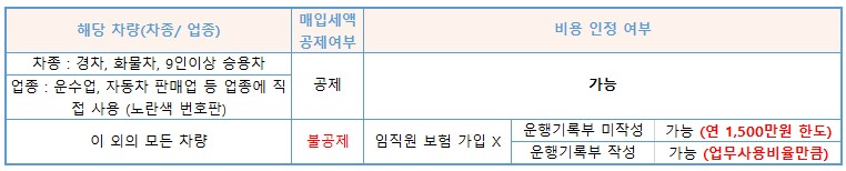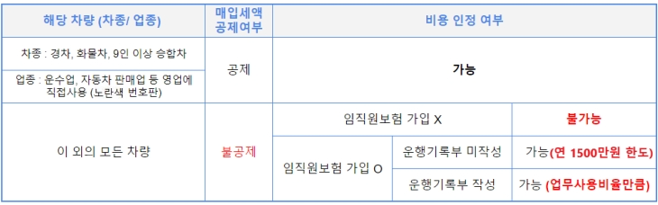 차량 매입세액 공제와 비용 인정 여부는 아래와 같이 구분됩니다.