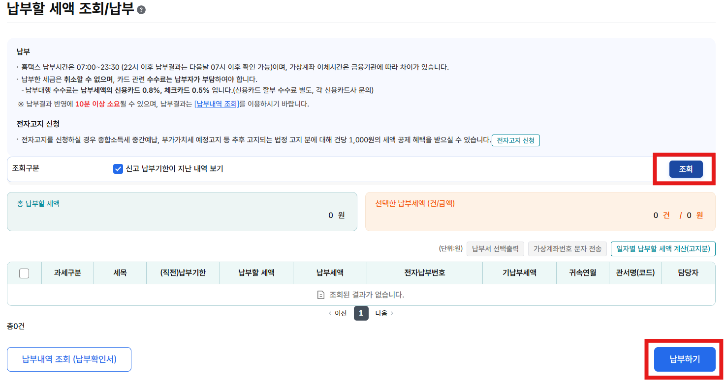 b. 홈택스 > [납부고지,환급] >[세금납부] > [납부할 세액 조회/납부]