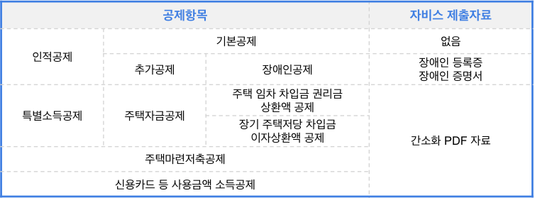 STEP 02 단계에서 자료를 제출하실 때 해당되는 항목의 증명자료를 반드시 제출해 주셔야 공제받으실 수 있습니다. 공제 항목별 제출자료와 유의사항을 다음과 같이 안내 드리겠습니다.