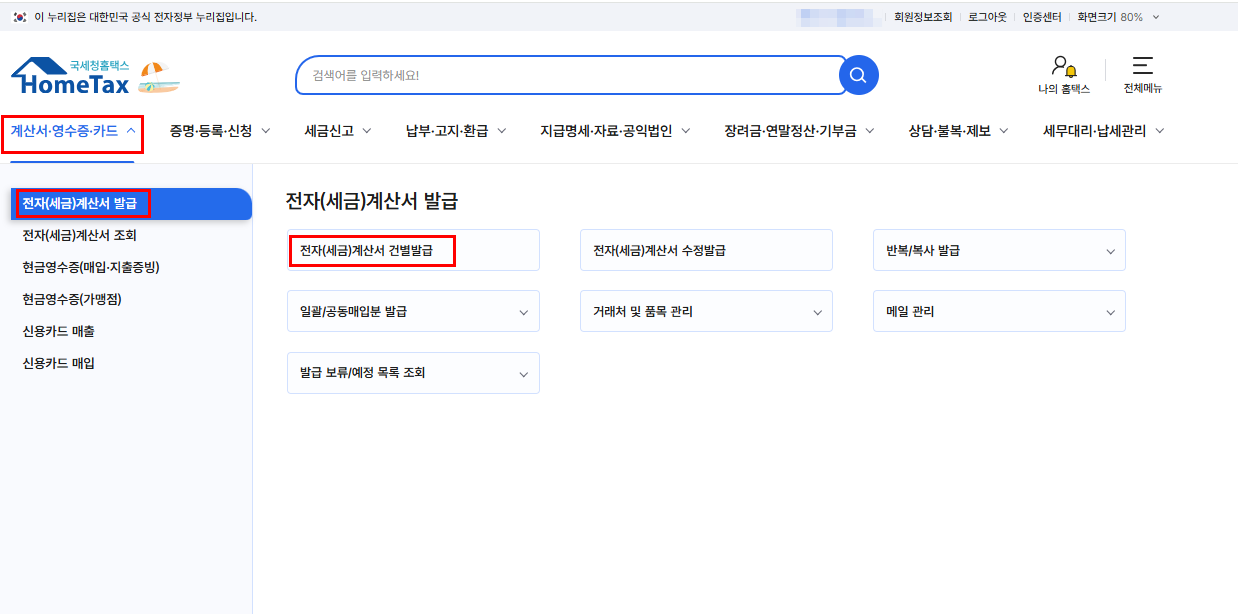 ② 홈택스 > [계산서·영수증·카드] > [전자(세금)계산서 발급] > [전자(세금)계산서 건별 발급]