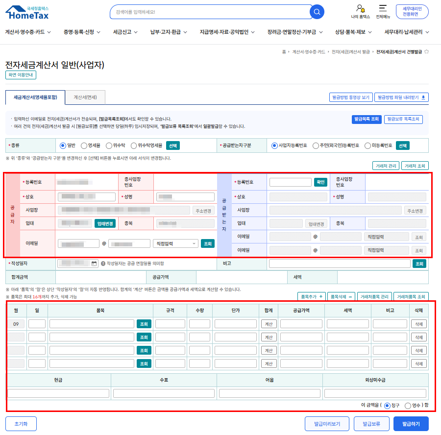 공급자/ 공급받는자의 정보, 거래 금액을 입력해 주시면 됩니다.