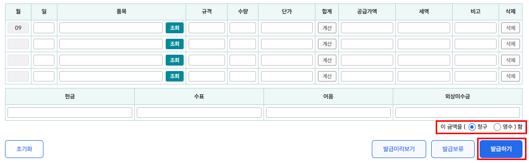 해당금액을 이미 받으신 경우 영수 / 아직 받기 전인 경우 청구로 선택 후,