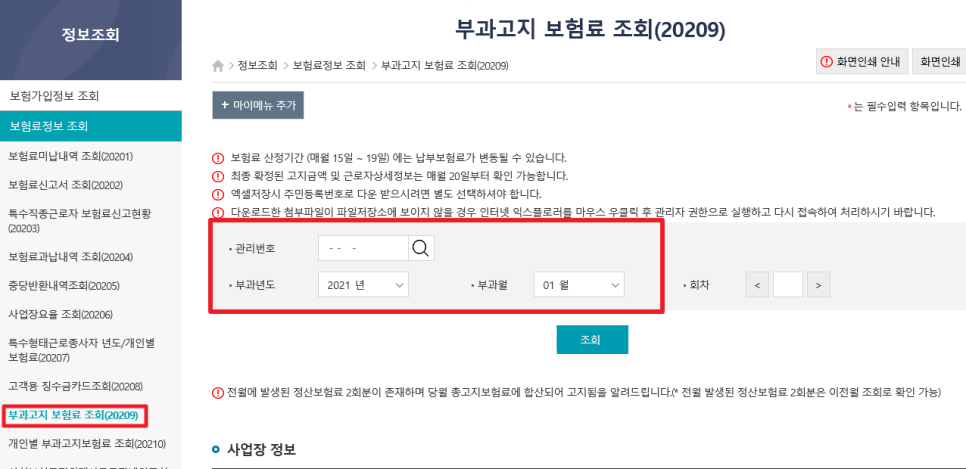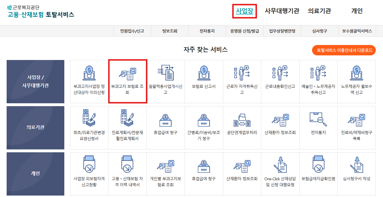2. [사업장] > [사업장/사무대행기관] > [부과고지 보험료 조회]
