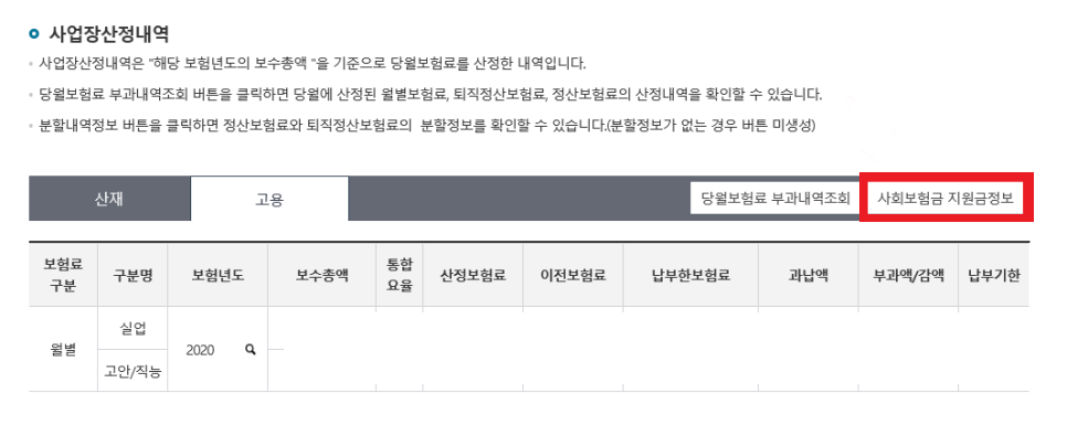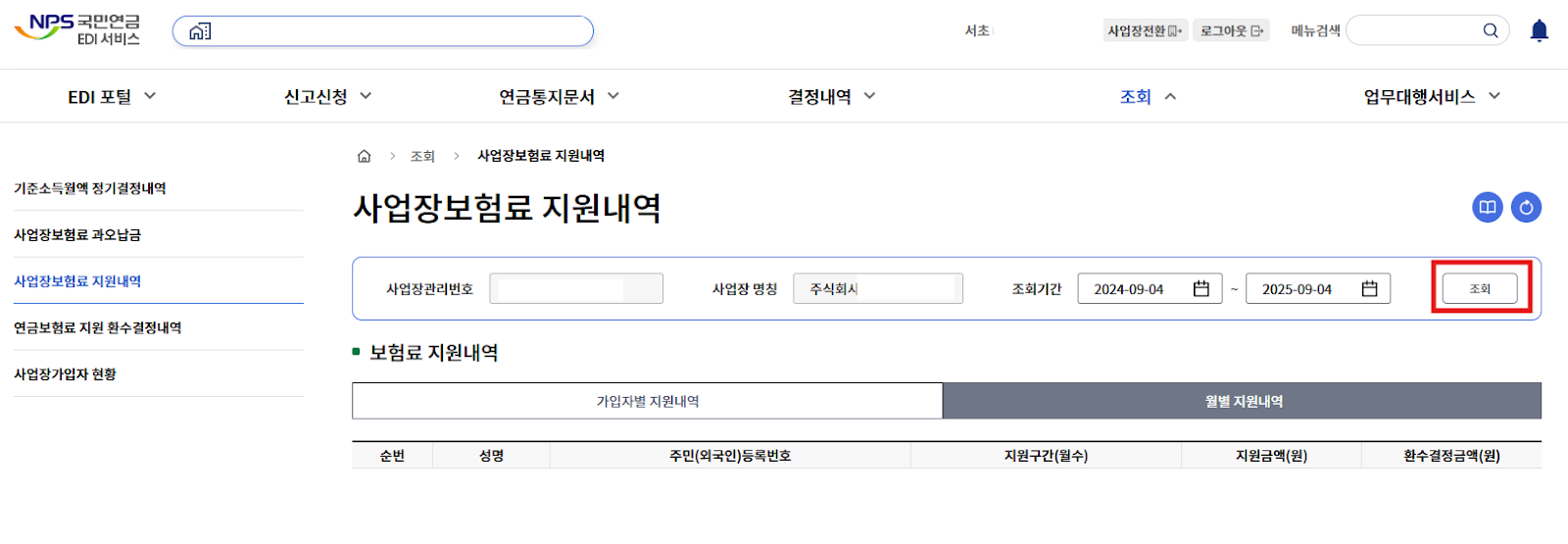 3. 관리번호 및 부과년도/월 입력 후 [조회] > [사회보험금 지원금정보]