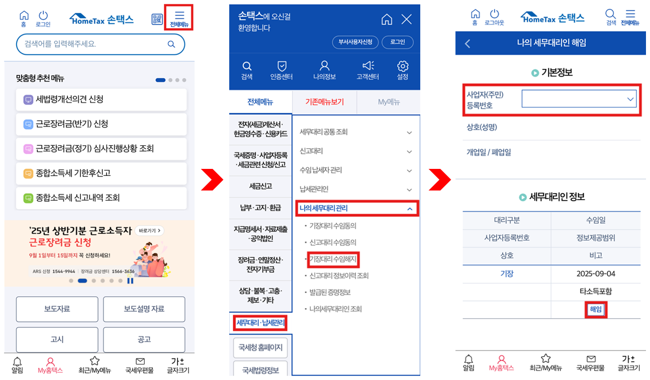 ② 고객님께서 직접 홈택스 로그인 후 수임해지 처리 가능합니다.