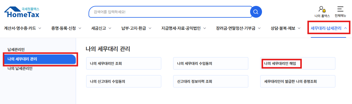 - 홈택스(hometax.go.kr) 로그인 > [세무대리·납세관리] > [나의 세무대리 관리] > [나의 세무대리인 해임] 클릭