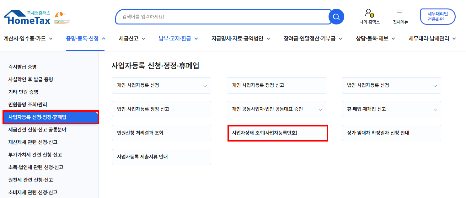 홈택스 > 증명/등록/신청 > 사업자등록 신청/정정/휴폐업 > 사업자 상태 조회