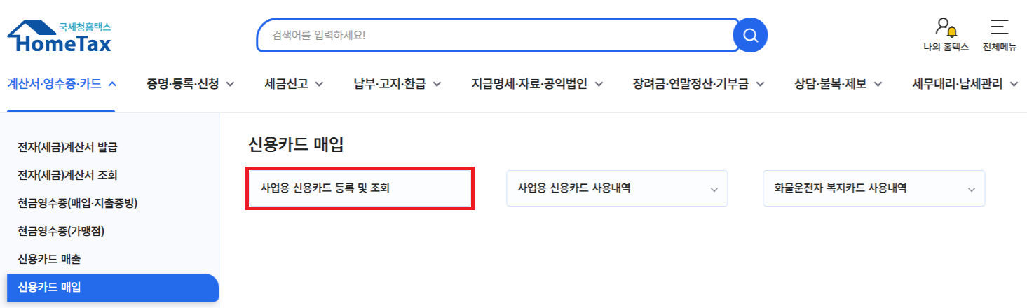 2. 홈택스 > 계산서ㆍ영수증ㆍ카드 > 신용카드 매입 > 사업용 신용카드 등록 및 조회