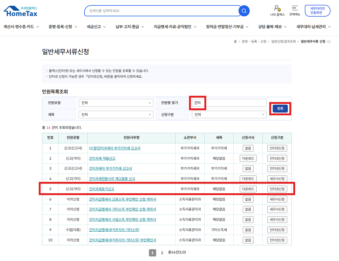 3. 민원명찾기 "간이" 검색 > 간이과세포기신고 - 인터넷신청